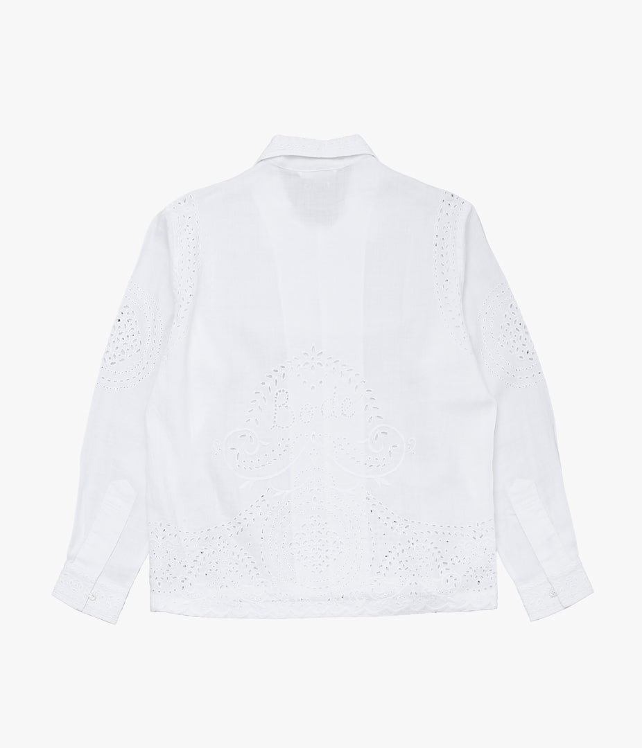 1890年代のベッドジャケットからインスピレーションを得たこちら、このシャツのためにブロデリー・アングレーズ(穴あき刺繍レース模様)のレースワークを再現されています。写真では伝わりづらいですが、背面の模様の一部に「Bode」の文字が取り入れられています。