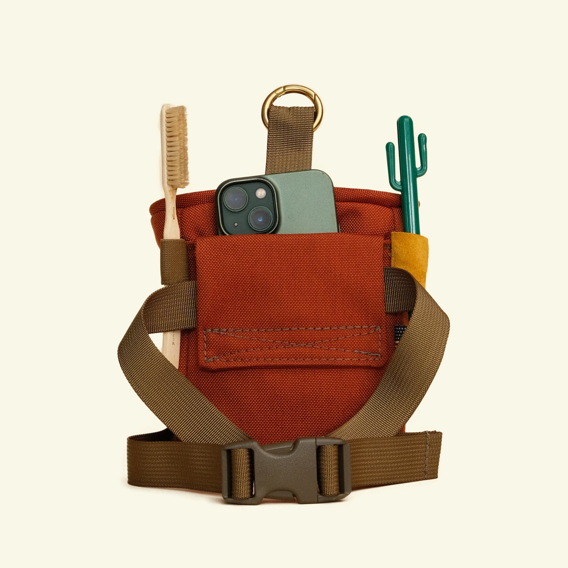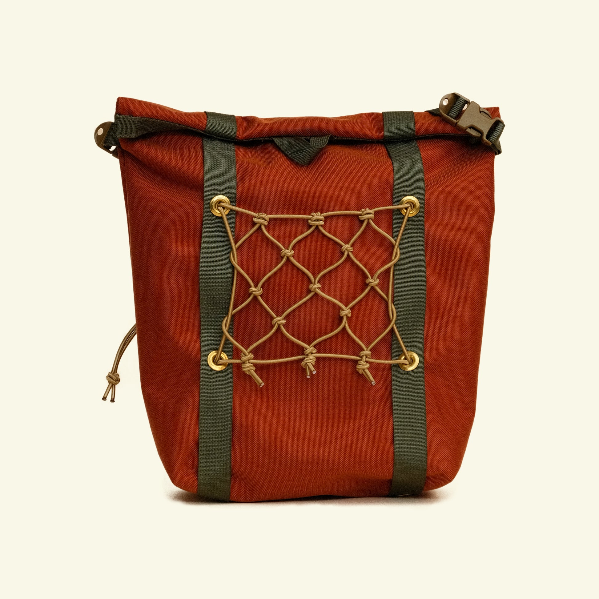 グランドキャニオンを彷彿とさせるレッドウォールカラー。上部はスナップボタンで留められ、フロントとバッグにはものを挟む/掛けることのできる伸縮性のあるロープがあり、見せる収納としてお使いいただけます。