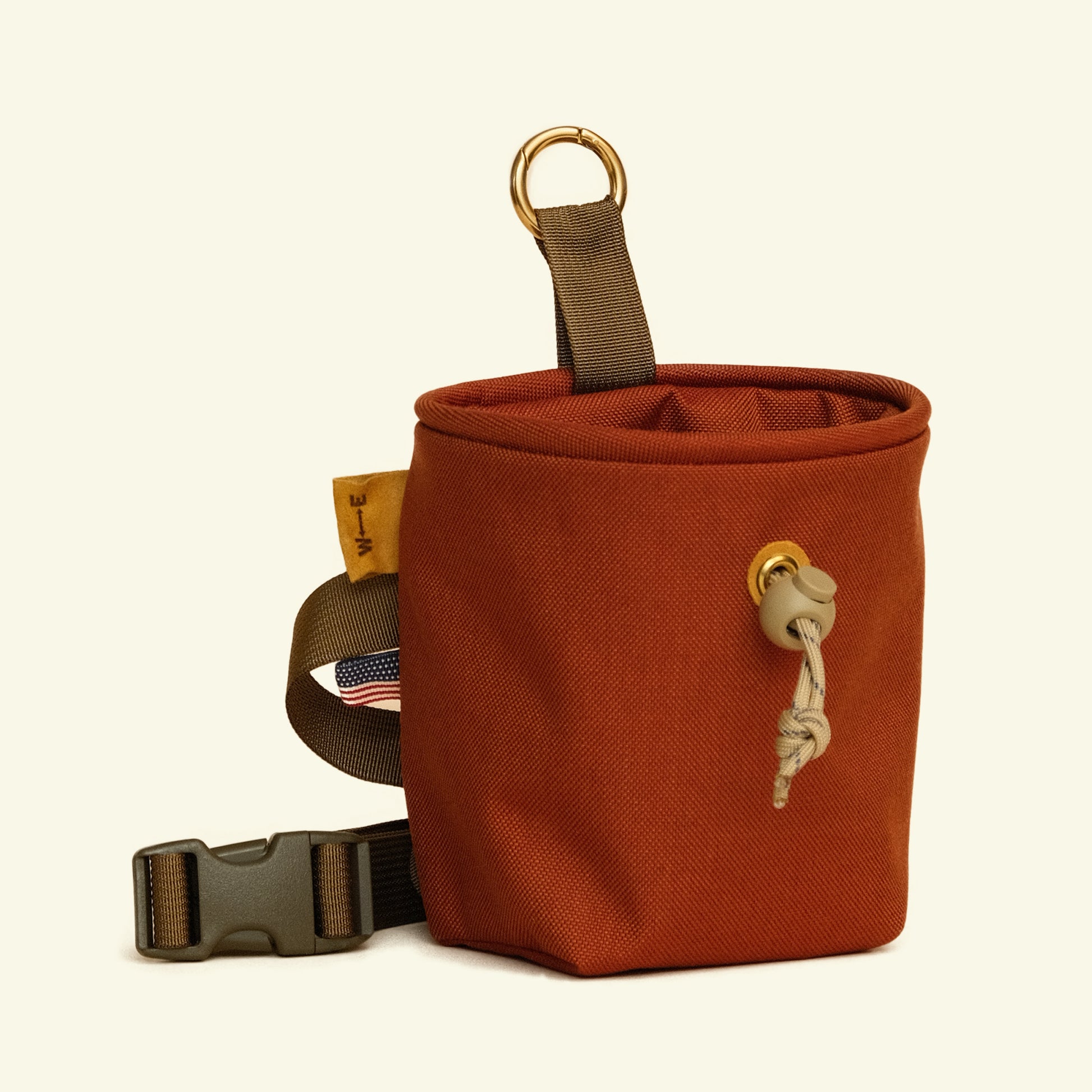 このバッグはクライミングや作業に適したシステムになっていて、ベルトを通せるループが背面と上部(リングの付いた短めループ)とで2箇所あります。背面に通すとウエストバッグの形になり体にぴたっと固定し邪魔にならない。上部に通すと吊り下がる構造になりますが自然に水平のバランスを保つようになっているので中身が偏らない。そしてベルトを使わずにハーネスやカラビナで取り付けても〇