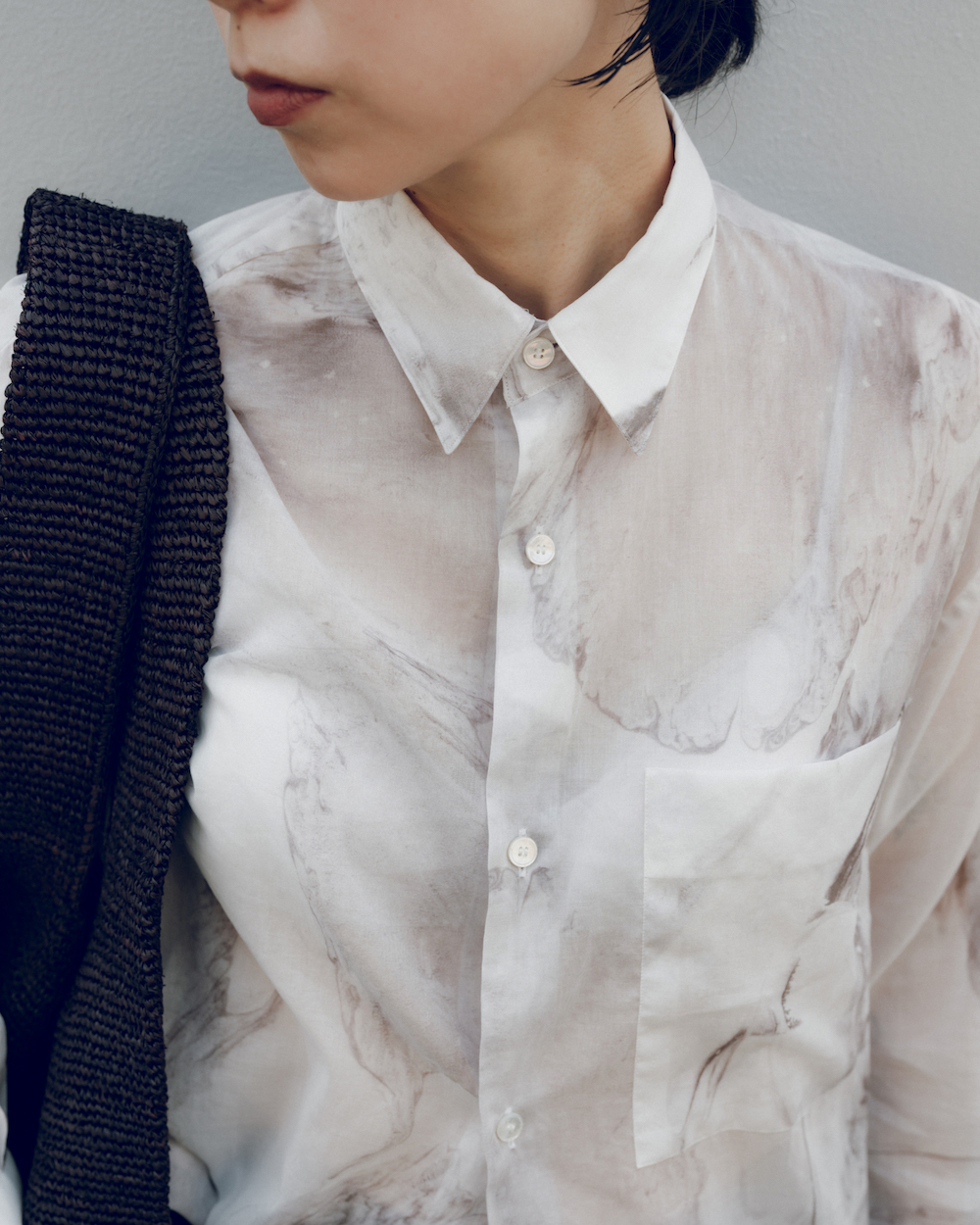 seya定番のシアーシャツ、今季はパリを拠点とするフランス人アーティストの Adrien Testard によるオリジナルプリントです。水彩画のような柔らかいタッチで描かれた彼の作品は、数々のファッションブランドともコラボレーションされていて、実はseya.も3回目。墨絵をイメージして描いたという繊細な柄と、薄いコットンローン生地で十津川の景色を彷彿とさせます。