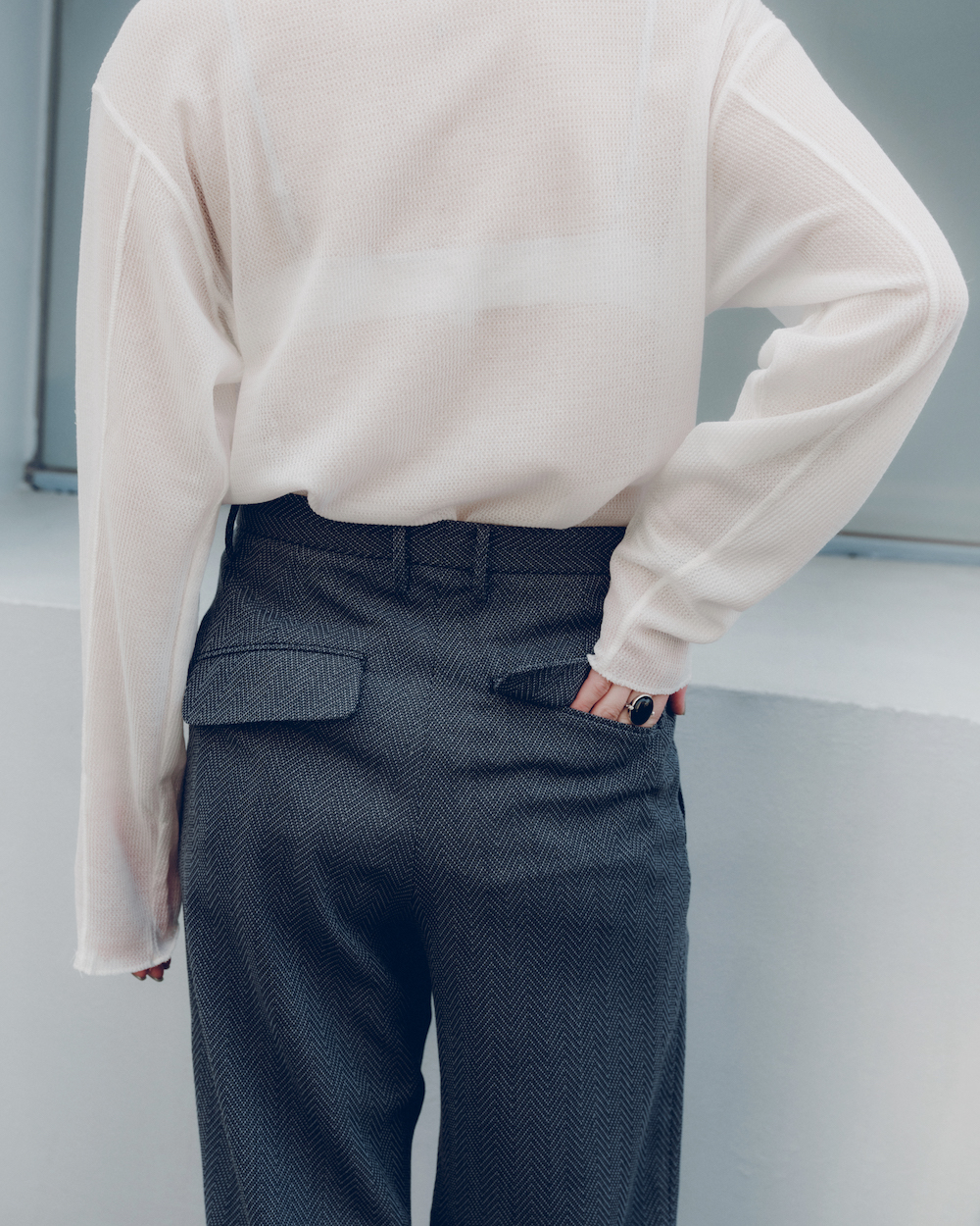 パンツがこれまた推しの一本。Super 100のサマーウールを使って、夏用のやや透けヘリンボーン生地で仕立てているこちらは、シャリ感があって涼しく、シワも付きにくくてすごく使い勝手が良さそうです。形はノータックのストレートシルエットで、すっと綺麗めな印象。