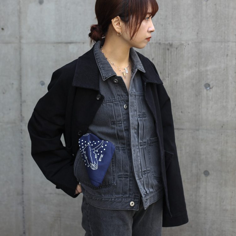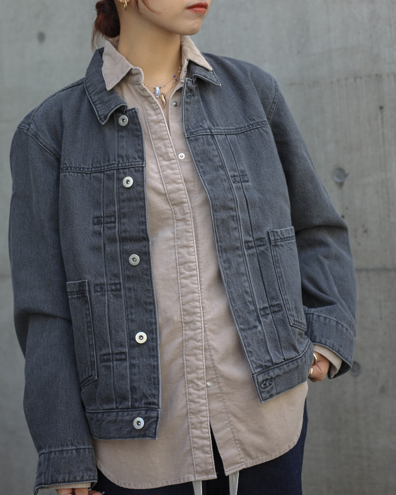 ジャケットは定番の『THE EMERALD DENIM JACKET UNISEX』。程よくコンパクトなサイズ感がコーディネートに合わせやすいです◎カラーは、“3年間着込んだような自然なアタリ” をソリッドブラックデニムで表現しています。