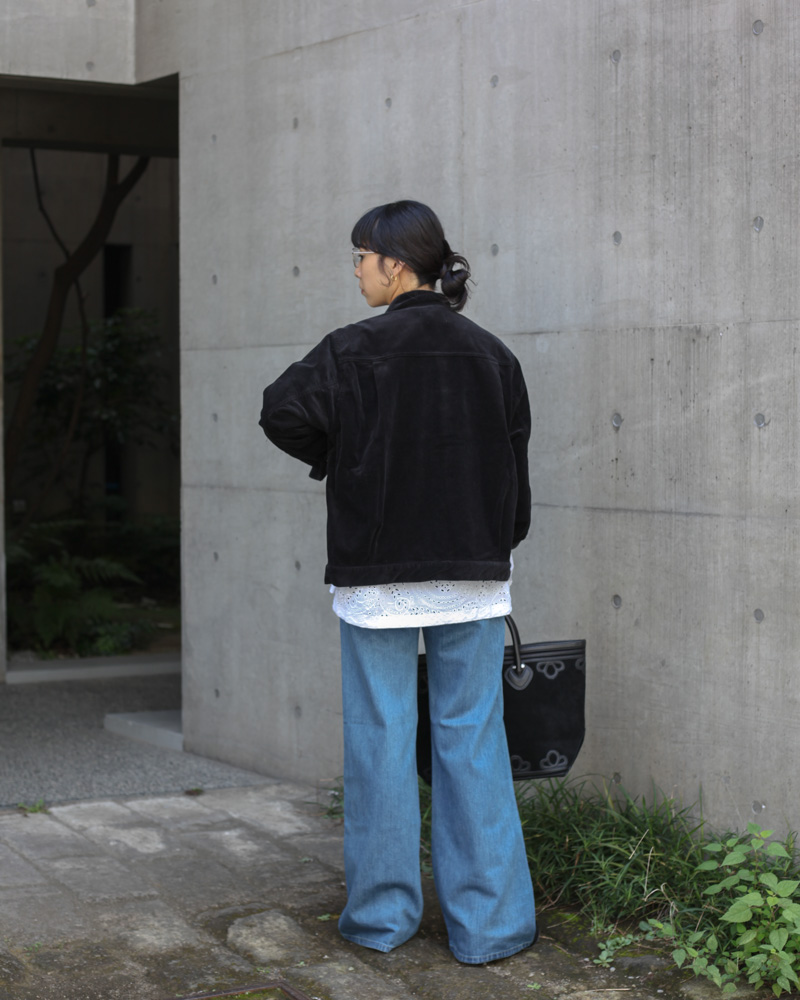 デニムは見えずらいのですが、濃いネイビーのコーデュロイジーンズ。ラピスラズリはヒップから腿にかけてのラインはゆとりを持たせ、レッグにかけてまっすぐに伸びるストレートシルエット。ワイドすぎないフィット感なのでデニム生地と比べるとやや肉厚のコーデュロイ生地でももたつかずにすっきり着ることができます。秋冬支度にはもってこいです。