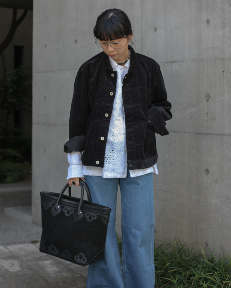 続いては、先ほどご紹介したジャケットのコーデュロイ『THE EMERALD CORDUROY JACKET UNISEX』。ヴィンテージアイテムでも注目度の高いコーデュロイジャケットですが、トレゾアらしい快適な着心地と洗練されたシルエットに◎インナーにはBODEのシャツを重ねて、カジュアルになりすぎず上品な印象に。