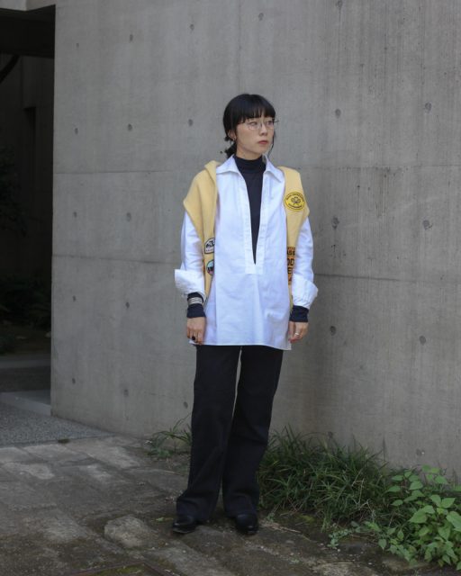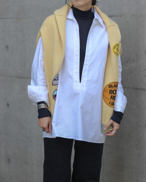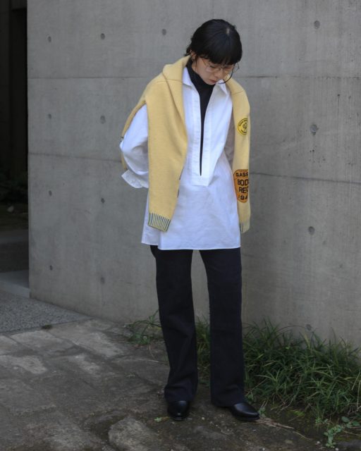 こちらも今季の新作であるオックスフォードヴァルーズシャツ。がしっとしたやや厚地の生地ならではの端正な佇まいと、女性らしい深いフロントVカットのバランスが格好良い一枚。深いカットラインに対して肩幅や身幅は広すぎず、丈は少し長めの縦長シルエットです。ヴィンテージの要素とクラシカルな要素、どちらも取り入れてモダンな女性像を追い求めるトレゾアらしいこのシャツ、個人的に推しです。秋冬にはもちろん、夏にはインナーにカラー物のベアトップを着ても素敵なので、オールシーズン着ていただけます。